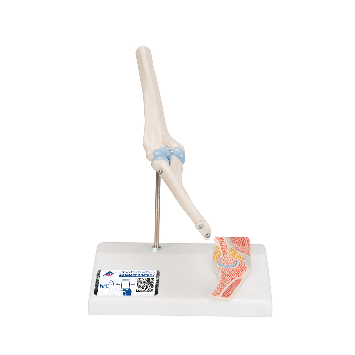 Модель локтевого сустава выполнена в половину натурального размера, с сохранением функционала модели локтя большего размера joint models. Внутреннее строение локтя продемонстрировано на представленном поперечном срезе.