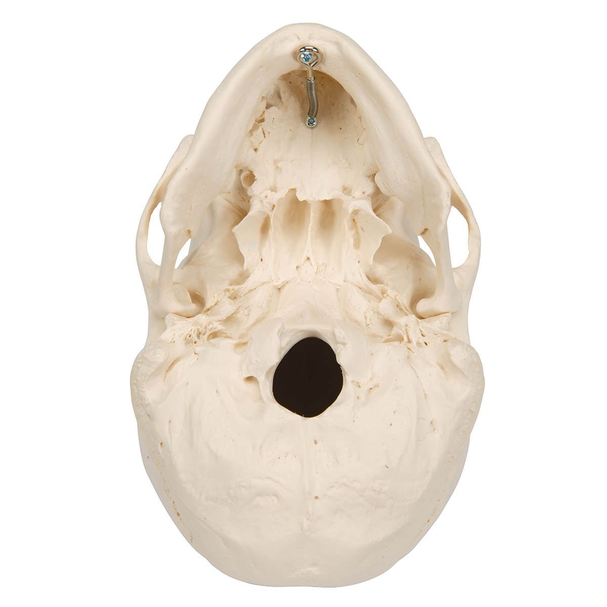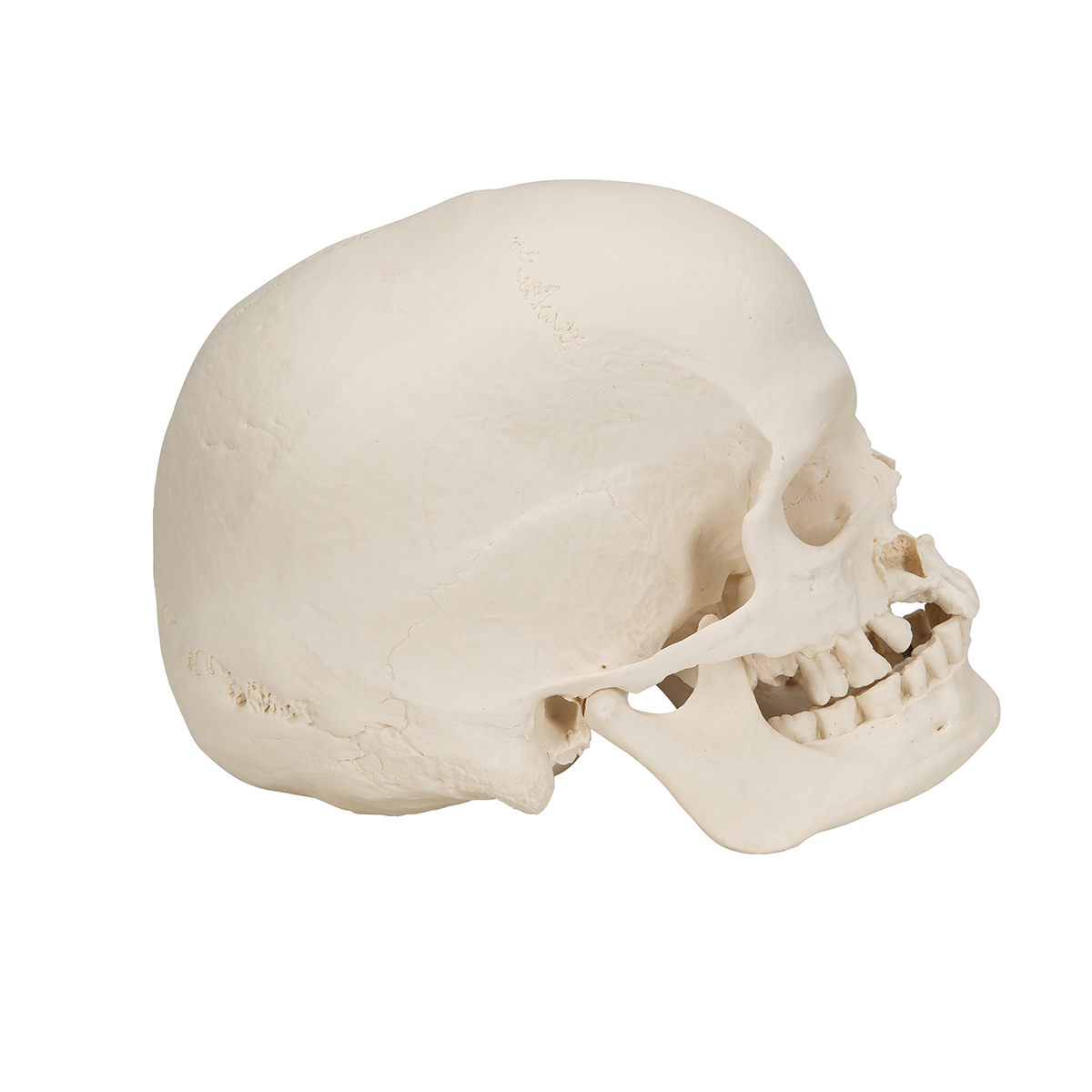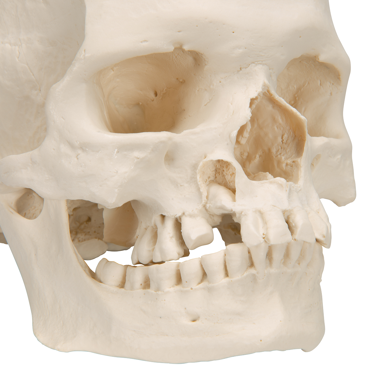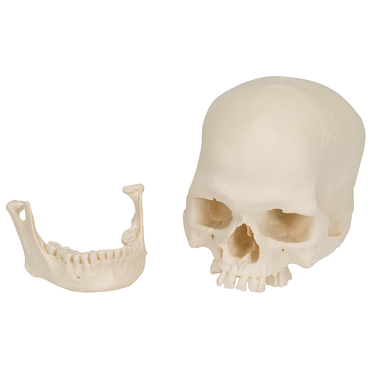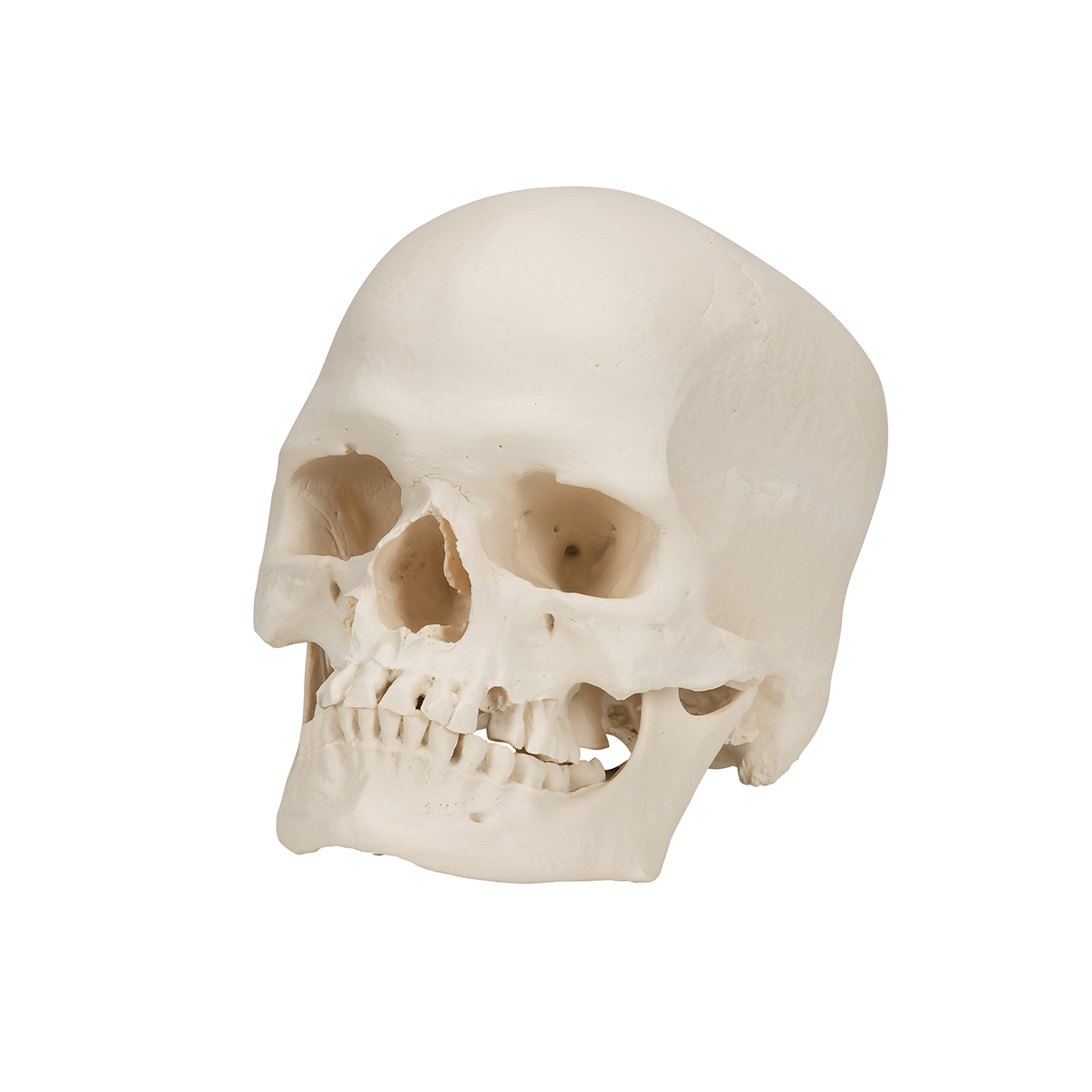 Это модель черепа молодого мужчины. Этот неразборный череп микроцефала имеет альвеолярный абсцесс правой верхней челюсти, где подвижен правый верхний клык. На коренных зубах показаны сильные истертости. 27 зубов. Копия с натурального черепа.