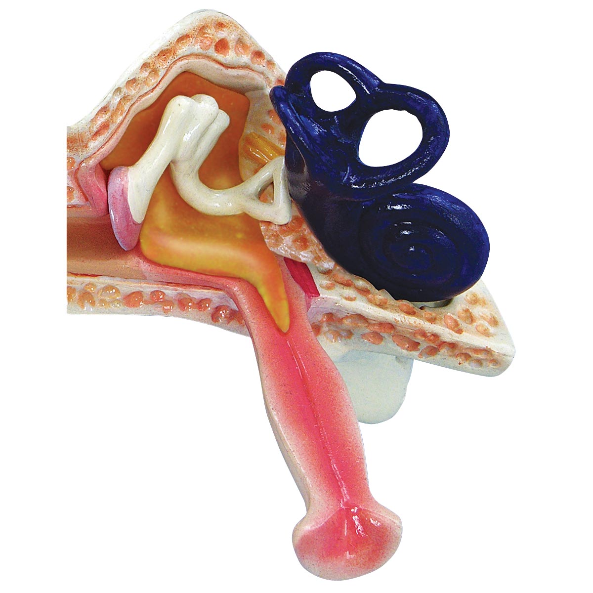 Данная увеличенная модель детского уха показывает: полукружные каналы и улитку внутреннего уха; слуховые косточки, средний отит (воспаление и имитация жидкости в среднем ухе); барабанную перепонку, височную мышцу и мышцу, напрягающую барабанную перепонку; на модели также представлена горизонтальная евстахиева труба, характерная для детей. Размер модели: 4,75 x 4 x 3,5". Подставка: 6,5 x 5".