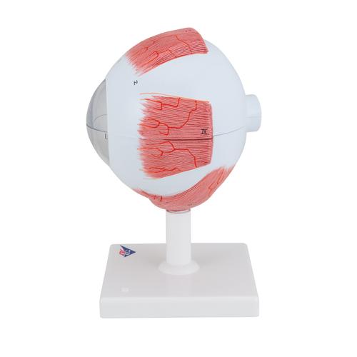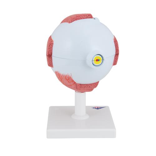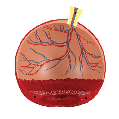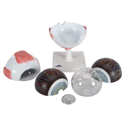 Первоклассная модель для занятий. Содержит следующие съемные части: верхнюю половину склеры с роговой оболочкой и присоединением глазных мышц • две половинки склеры роговицей • хрусталик и стекловидное тело