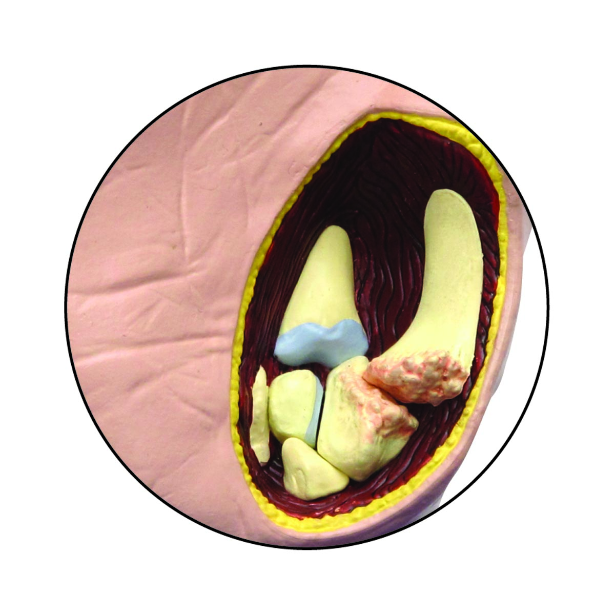 Модель кисти руки при остеоартрите представляет собой правую кисть в натуральную величину с разрезами, показывающими проявления остеоартрита: остеофиты (костные шпоры), узелки Гебердена и Бушара, деформацию большого пальца в виде шеи лебедя. Показаны и другие анатомические структуры, поражаемые при остеоартрите: связки, сухожилия, мышцы и хрящи. Для сравнения показана также нормальная анатомия. Размер модели: 5 x1,75 x 7,5". Подставка: 6,5 x 5".
