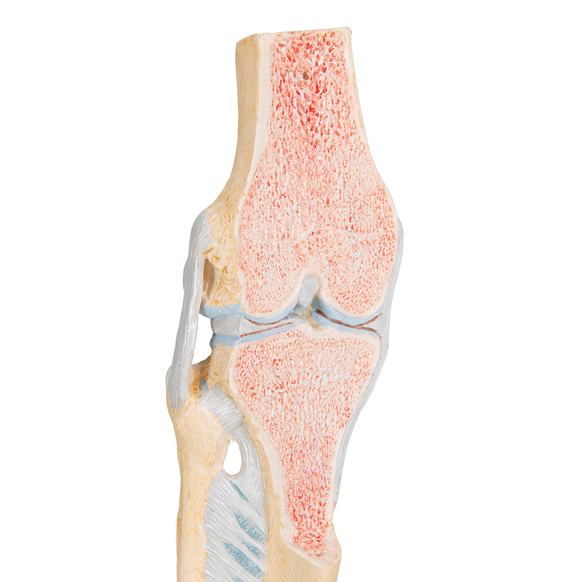 Эту модель можно использовать для наглядной демонстрации различных заболеваний коленного сустава у человека и соответствующих методов лечения. Модель представляет собой макет здорового правого коленного сустава в натуральную величину в вертикальном положении, включая фрагменты бедренной кости, большеберцовой кости и малоберцовой кости, а также связочный аппарат и надколенник с фрагментом бедренного сухожилия. Надколенник и прикрепленное к нему сухожилие и передняя половина модели (с фронтальным сечением) могут быть сняты, чтобы показать внутренние анатомические образования. Модель укреплена на подставке.