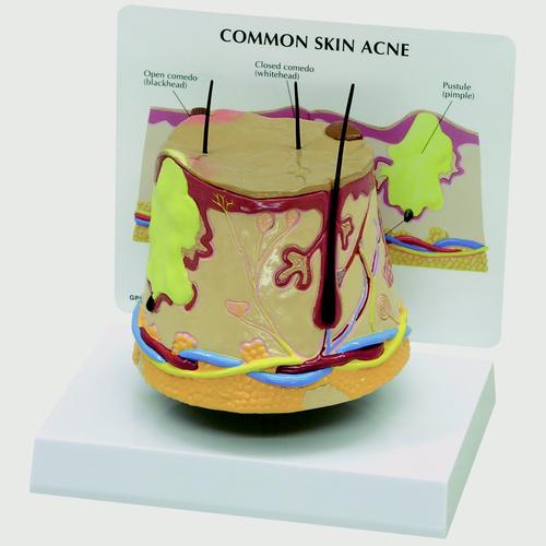 Модель кожной угревой сыпи представляет собой увеличенное цилиндрическое поперечное сечение кожи; на задней стороне показано рельефное изображение трех состояний: пустулезные угри (пустулы), закрытые комедоны (белые угри), открытые комедоны (черные угри). Также в разрезе показана нормальная кожа: эпидермис, дерма, подкожная клетчатка, включая волосяные фолликулы.