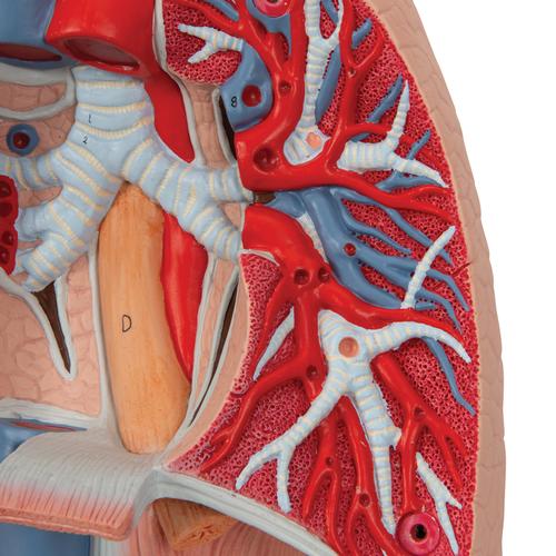 Эта первоклассная модель имеет следующие составные части: • гортань (2 части) • трахею с бронхиальным деревом • сердца (2 части) • артерию и подключичную вену • аорту • легочную артерию • пищевод • легкие (2 половины) • диафрагму на подставке