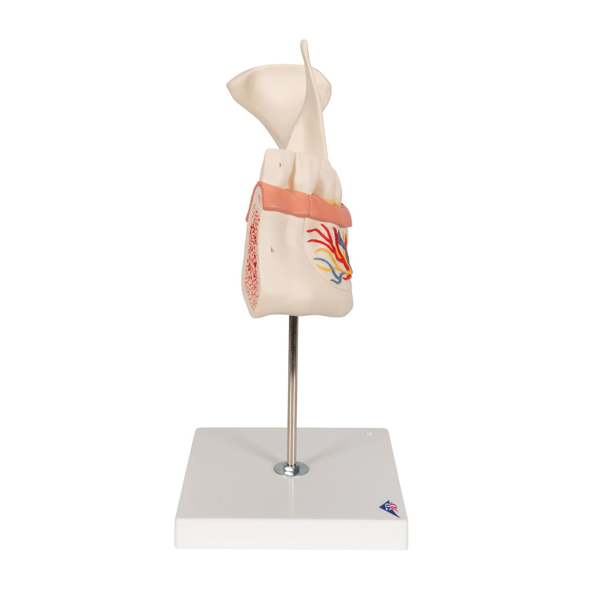 Эта модель показывает левую половину нижней челюсти молодого человека. Для детального осмотра корня зуба, спондиоза, сосудов и нервов – кости съемные. Клык и первый коренной зуб разрезаны и вынимаются. На подставке