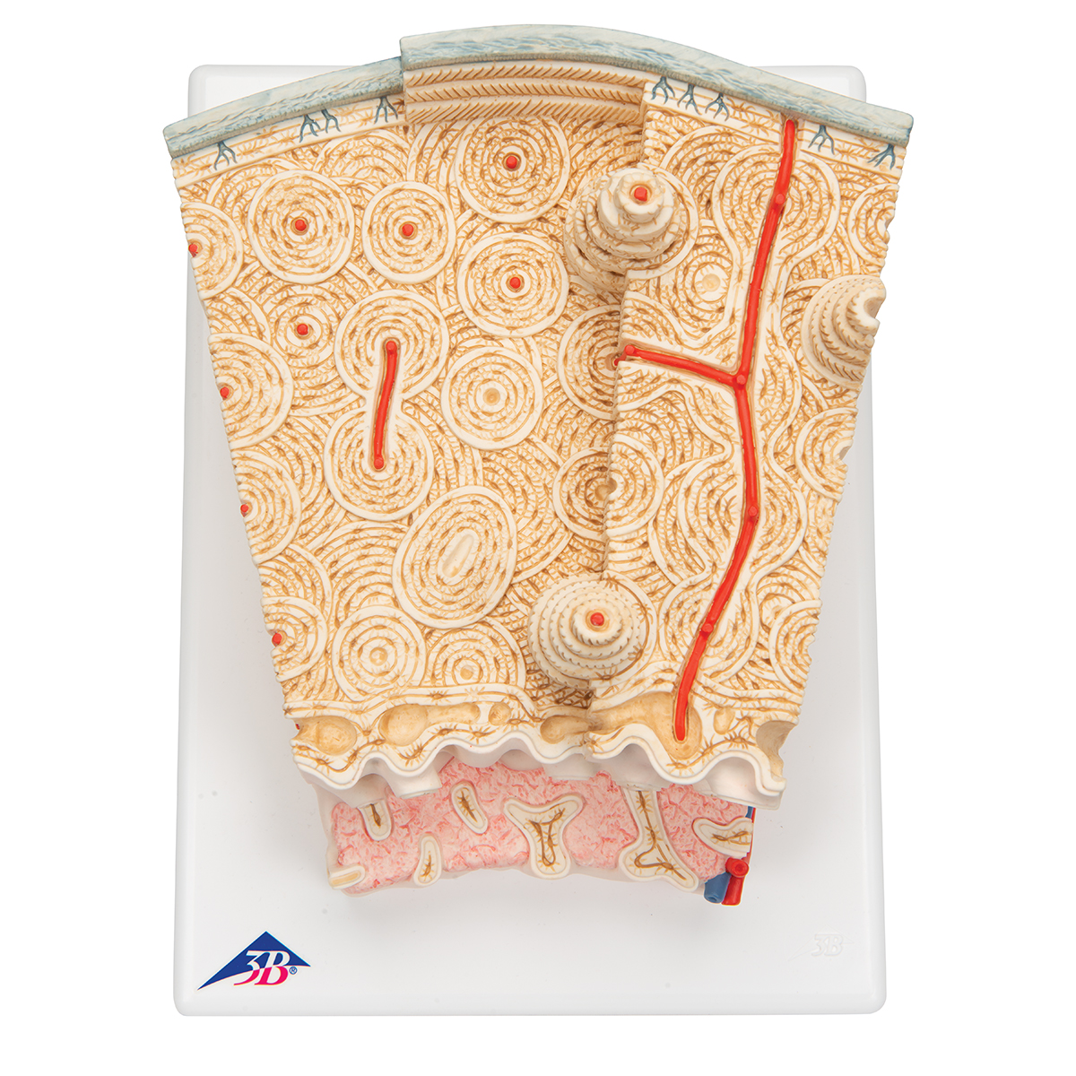 Эта исключительно подробная модель представляет собой трехмерный срез пластинчатой кости. Модель демонстрирует типичное строение трубчатой кости, увеличенной в 80 раз. Различные плоскости показаны в поперечном и продольном сечениях через все уровни кости, а также в двухмерном сечении через внутреннюю структуру костного мозга. Характерные элементы пластинчатой кости легко определимы, что помогает понять ее структуру и функцию на примере основных структурных единиц – остеонов, также известных под названием Гаверсовой системы. Эта модель позволяет увидеть графическое представление взаимосвязи отдельных компонентов, таких как губчатое и компактное вещество кости, эндост, корковое вещество, остеоциты, фолькмановские и гаверсовы каналы. Модель имеет подставку.
