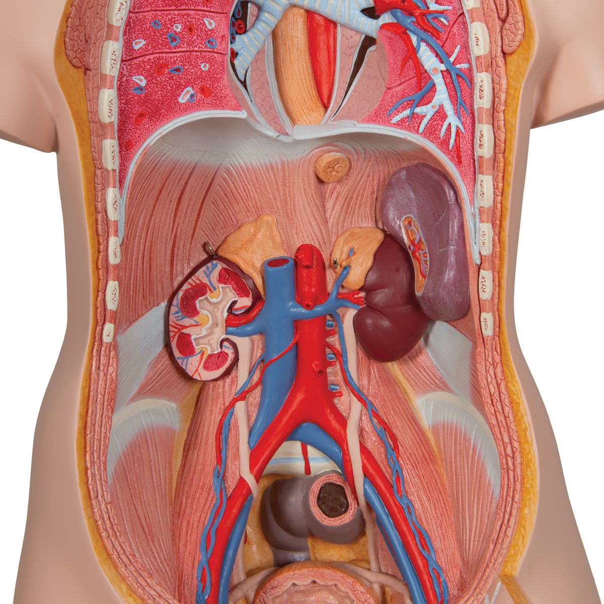 Базируется на школьной модели торса В11. Модель предназначена для студентов. Открытая спина от мозжечка до копчика. Позвоночник, межпозвонковые диски, спинной мозг, спинномозговые нервы, позвоночные артерии и многое другое показаны очень детально. Торс имеет: голова (7 частей) 2 легких с грудно-реберным сочленением сердце (2 части) желудок (2 части) печень с желчным пузырем кишечник (4 части) передняя часть почек и мочевого пузыря дополнительно к В11 имеет 7-съёмных грудных позвонков Поставляется с руководством к торсам (В01).