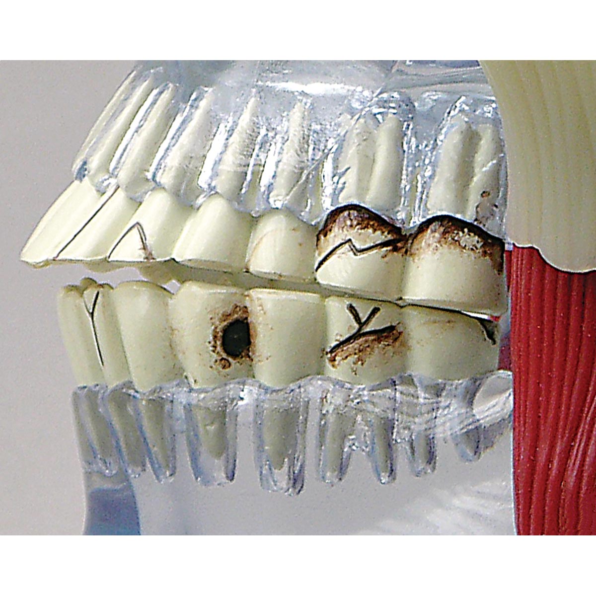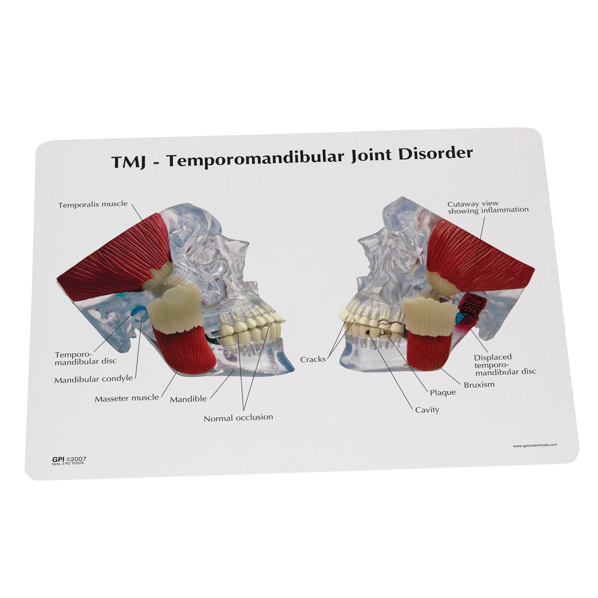 Модель височно-нижнечелюстного сустава (ВНЧС), показывающая проблемы, связанные с суставной капсулой. Акцент сделан на сепарационный зубной диск, воспаление окружающей костной ткани, а также на зубные проявления (сколы, трещины, полости, а также признаки бруксизма)