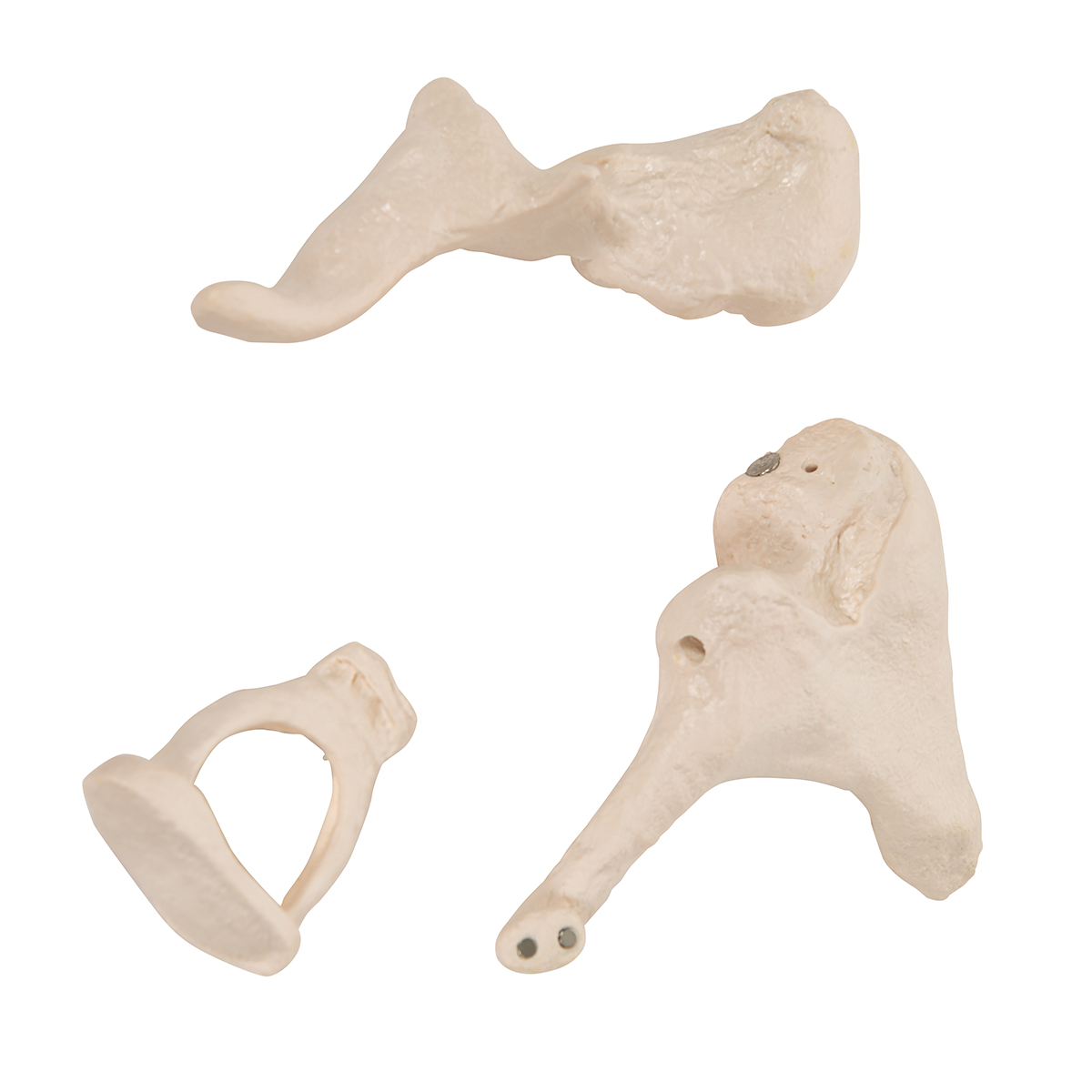 Три самых маленьких кости в теле человека соединены между собой, располагаются в среднем ухе и называются слуховыми косточками: молоточек, наковальня и стремя. Их функцией является передача поступающего звукового сигнала от барабанной перепонки через окно преддверия к внутреннему уху и механическое усиление звука. Внутреннее ухо должно быть защищено от длительного вредного воздействия, например громкого шума. Это достигается с помощью рефлекса, вызывающего движение мышцы (стременной), которая на короткое время отклоняет стремечко, благодаря чему происходит лишь частичная передача звукового сигнала. При очень энергичном встряхивании слуховых косточек (например, при чихании и кашле), защиту обеспечивает другая мышца (мышца, напрягающая барабанную перепонку), фиксируя молоточек и натягивая барабанную перепонку. Отосклероз — распространенное заболевание с поражением слуховых косточек, приводящее к их ригидности, и, как следствие, прогрессирующему ухудшению слуха. В нашей модели представлены литые, увеличенные в размерах копии оригинальных слуховых косточек, созданные методом микрокомпьютерной томографии.