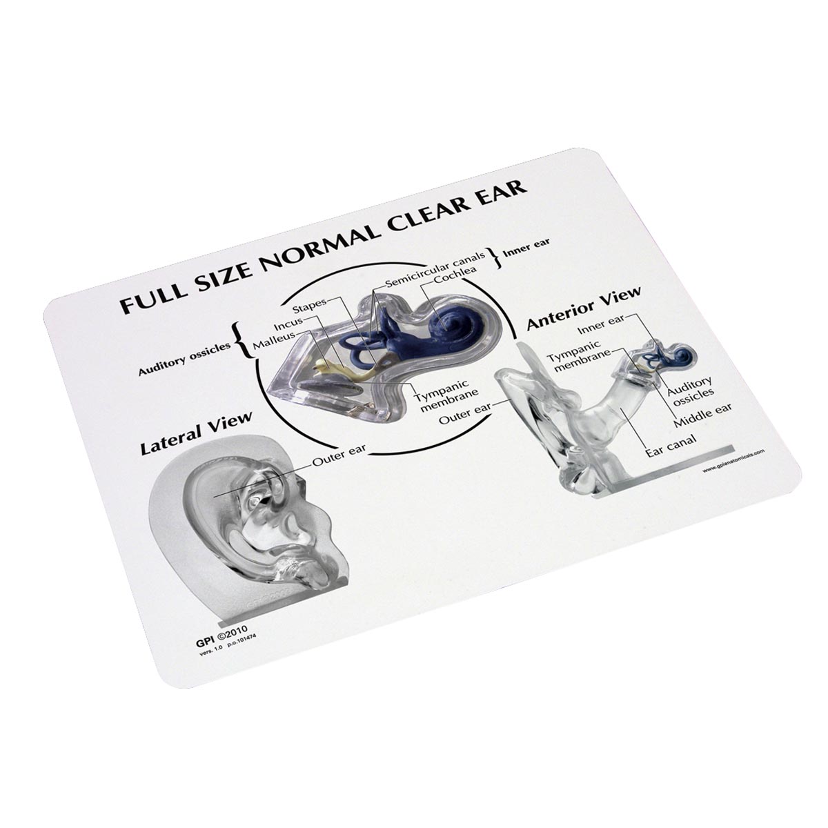 Прозрачная модель уха представляет собой модель уха человека в натуральную величину, которая выполнена прозрачной, с тем чтобы лучше рассмотреть слуховой канал, барабанную перепонку, стремя, наковальню, молоточек и улитку внутреннего уха. Размер модели: 3,1 x 3 x 2,3".