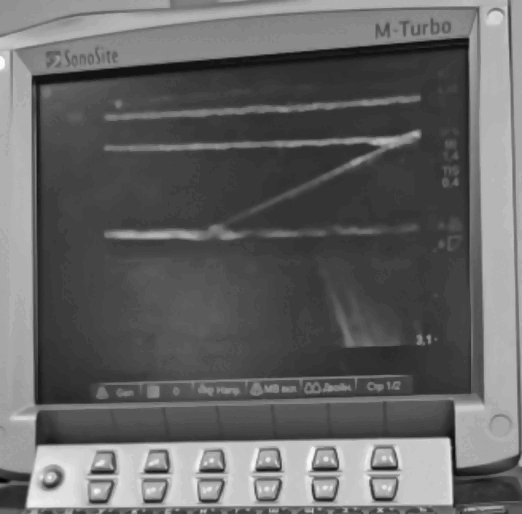 ВИЗУАЛИЗАЦИЯ ИГЛЫ В ФАНТОМЕ Фантом содержит в себе структуры, имитирующие наружную косую, внутреннюю косую и поперечную мышцу. Игла хорошо визуализируется в фантоме не только когда она параллельна датчику, но и под любыми углами и на любой глубине. От острых игл практически не остается треков, и даже те, что остаются — чаще всего со временем затягиваются. |