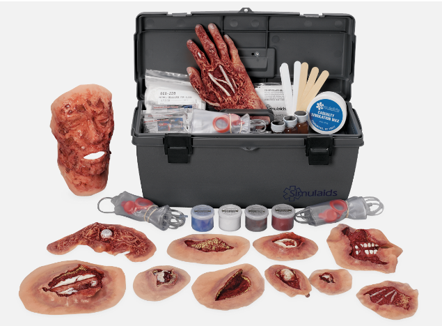 Тематические накладки с различными повреждениями для размещения на манекене или стандартизированном пациенте, в комплекте с принадлежностями для грима Муляжи для моделирования различных травм и создания большего реализма при обучении.