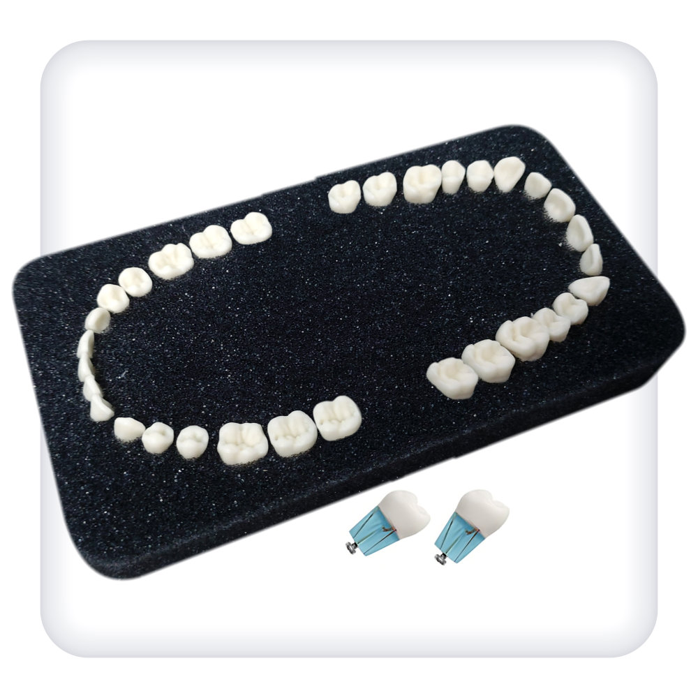 Представляет собой комплект из 32 модельных зубов естественной формы, прозрачных на уровне корня, с корневыми каналами, окрашенными в красный цвет.