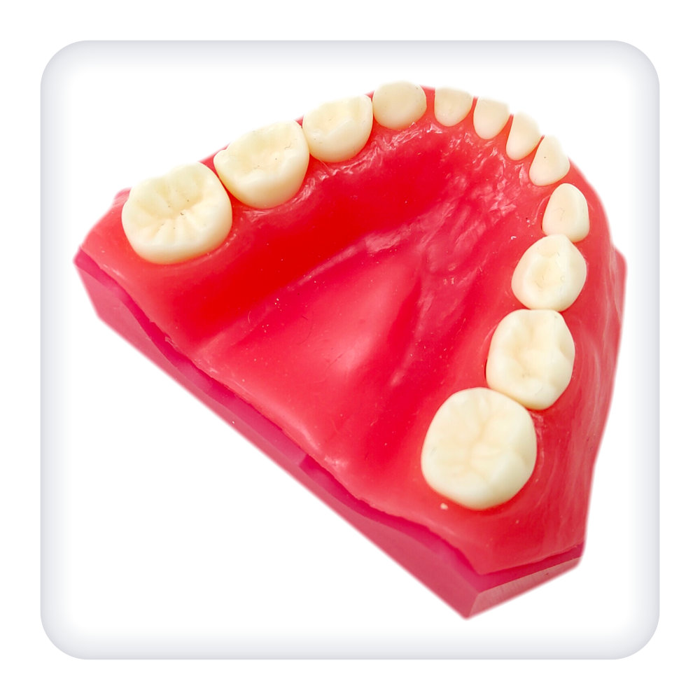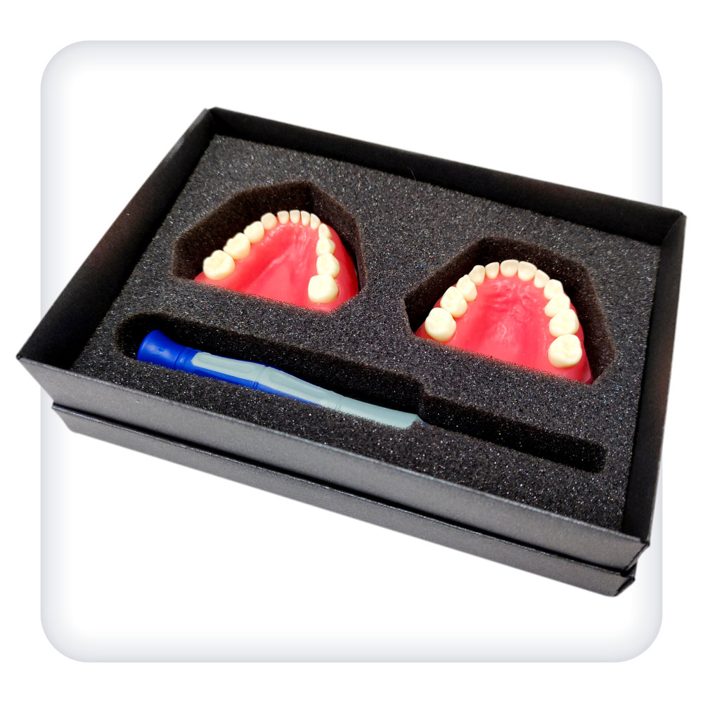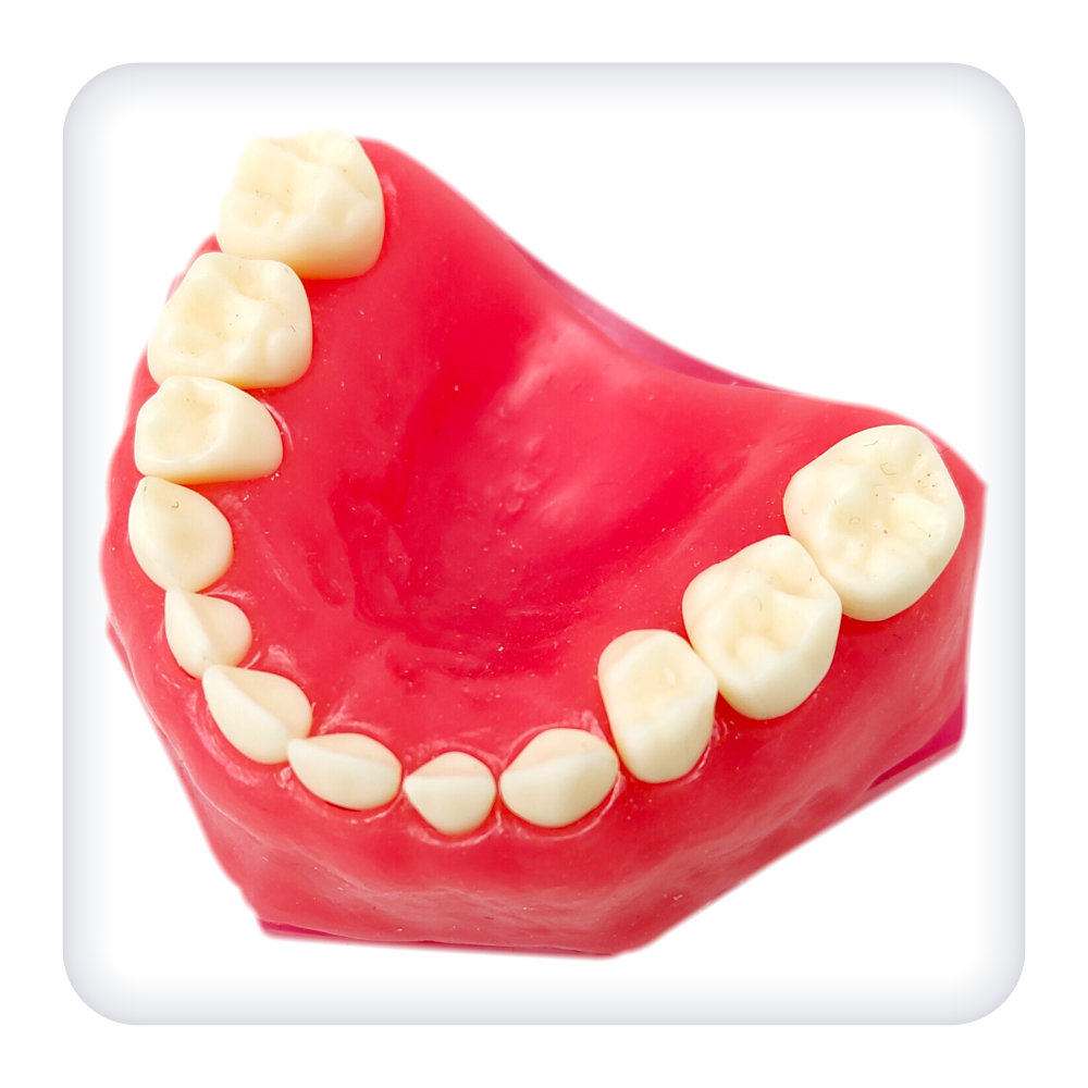 Представляет собой стоматологическую модель верхней и нижней челюстей с эластичной десной. Анатомически соответствующую зубочелюстному аппарату ребенка. Смыкание реализовано в стабильной окклюзии. В комплект включены 24 модельных зуба. 20 постоянных зубов фиксируются при помощи винтов, 4 временных зуба не зафиксированы, что позволяет продемонстрировать процесс их выпадения у детей.