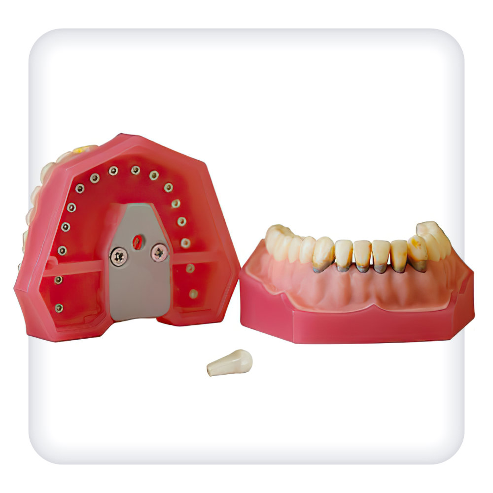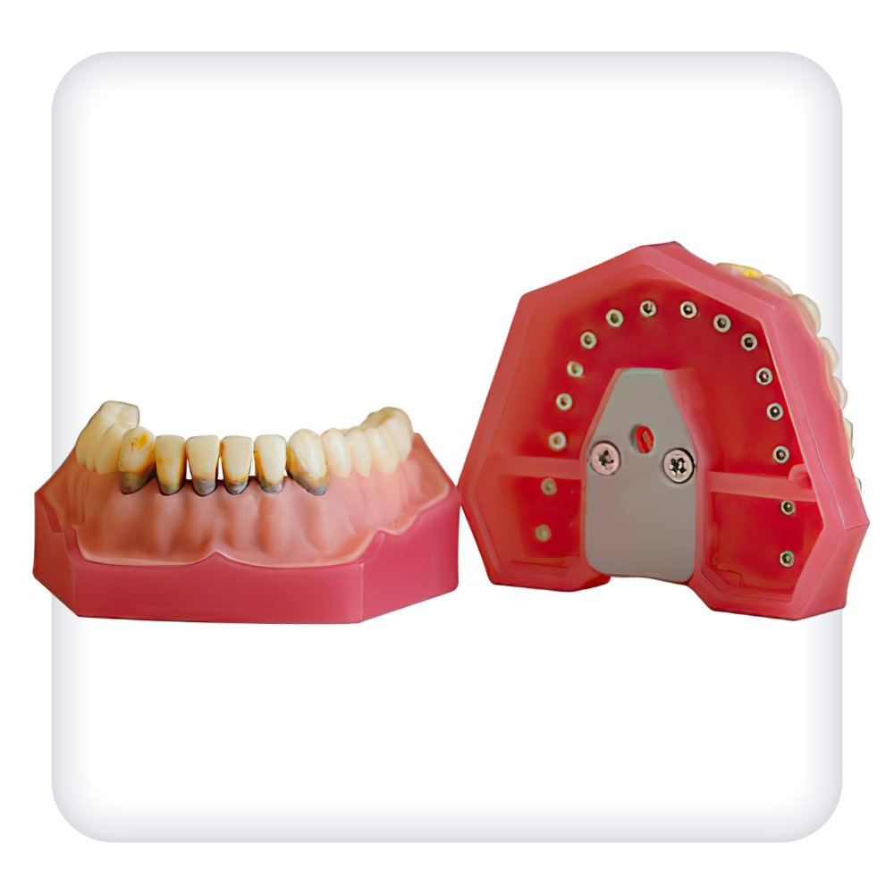 Модель предназначена для освоения терапевтических навыков по удалению поддесневых отложений. Съемные зубы закрепляются при помощи винтов. Эргономичная система крепления позволяет легко установить модель в окклюдаторе и тренажере.
