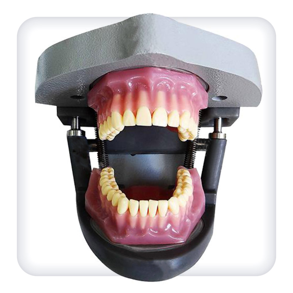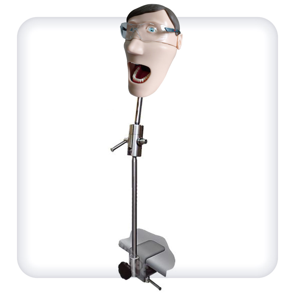 Представляет собой модель головы человека, установленную на универсальной шарнирной опоре. Система фиксации позволяет устанавливать тренажер в любое удобное положение в зависимости от поставленных задач и учебного процесса. Для реалистичности проведения практических занятий на модели головы реализованы нос, глаза, уши и открытая ротовая полость. Тренажер дает возможность установки различных моделей известных производителей. В модель встроен регулируемый артикулятор, воспроизводящий движения нижней челюсти. Покрытие модели головы выполнено из эластичного, износостойкого материала.